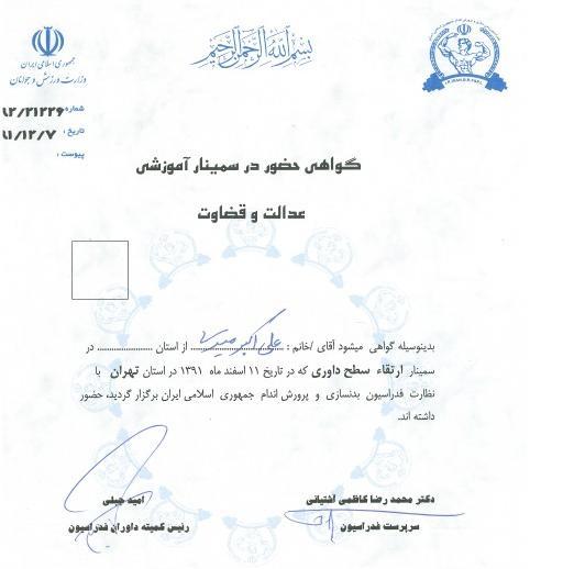 9 .گواهی حضور در سمینار اموزشی عدالت و قضاوت از کمیته داوران فدراسیون بدن سازی