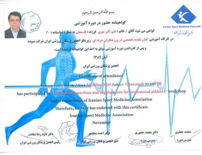 3. مدرک حرکت شناسی و علم تمرین از انجمن پزشکان ورزشی ایران